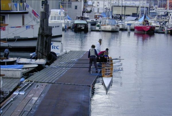With the City’s assistance and permission, that search was concluded when BIR’s shells and oars were relocated to a rented chain-link fence enclosure in Eagle Harbor’s Waterfront Park during the September of 2001. The arrangement may have still been quite primitive: shells in slings, oars lying on the ground, and if anyone forgot the key, rowers had to become skilled at crawling under the fence and passing the boats out over the top! The boats were still beach-launched, but now that beach was just west of the public boat dock and into protected waters.