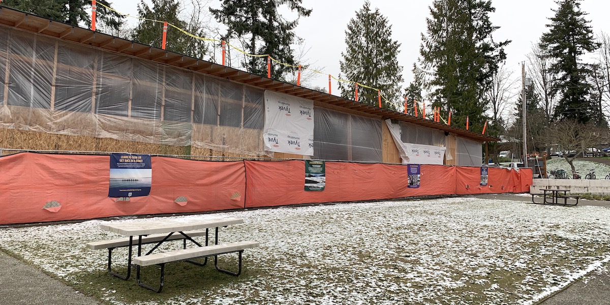BIR’s Rowing Center is all framed up in Waterfront Park and about to be sealed. The plein-air cement foundation that for several years has housed the rowing club’s boats, team meetings, and erg sessions now has a second story, walls, and a roof.